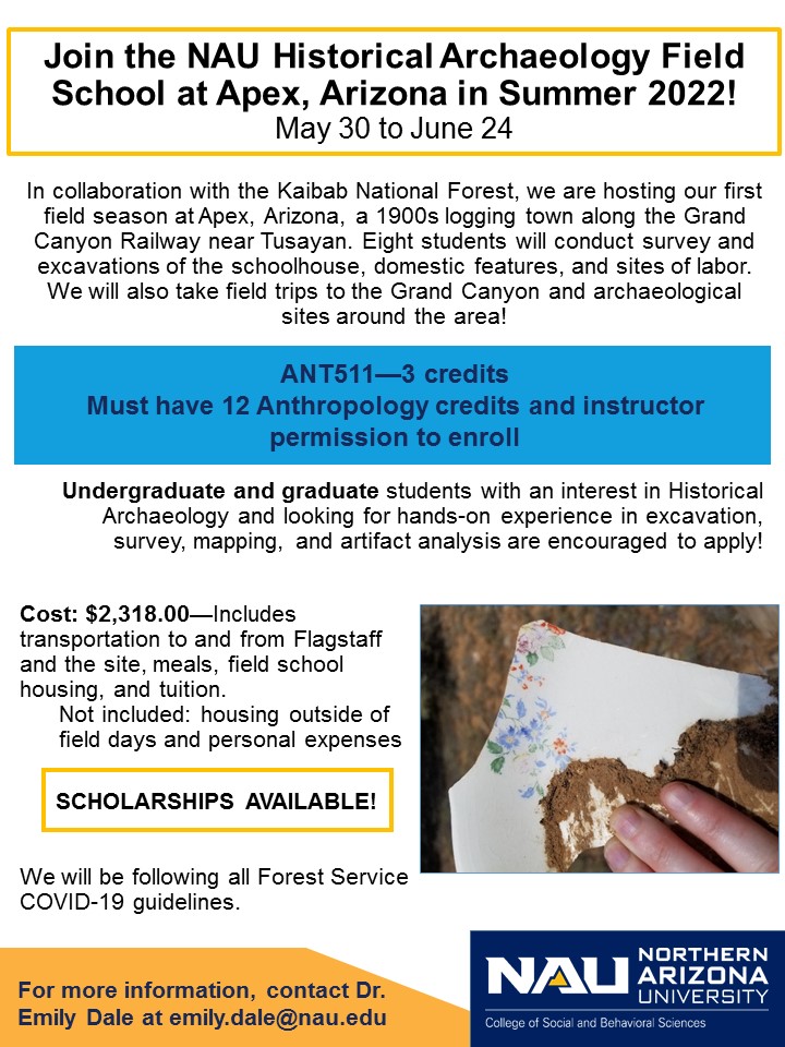 For more information and an application, visit https://nau.edu/anthropology/apex-arizona-archaeology-project/ or contact Dr. Emily Dale at emily.dale@nau.edu