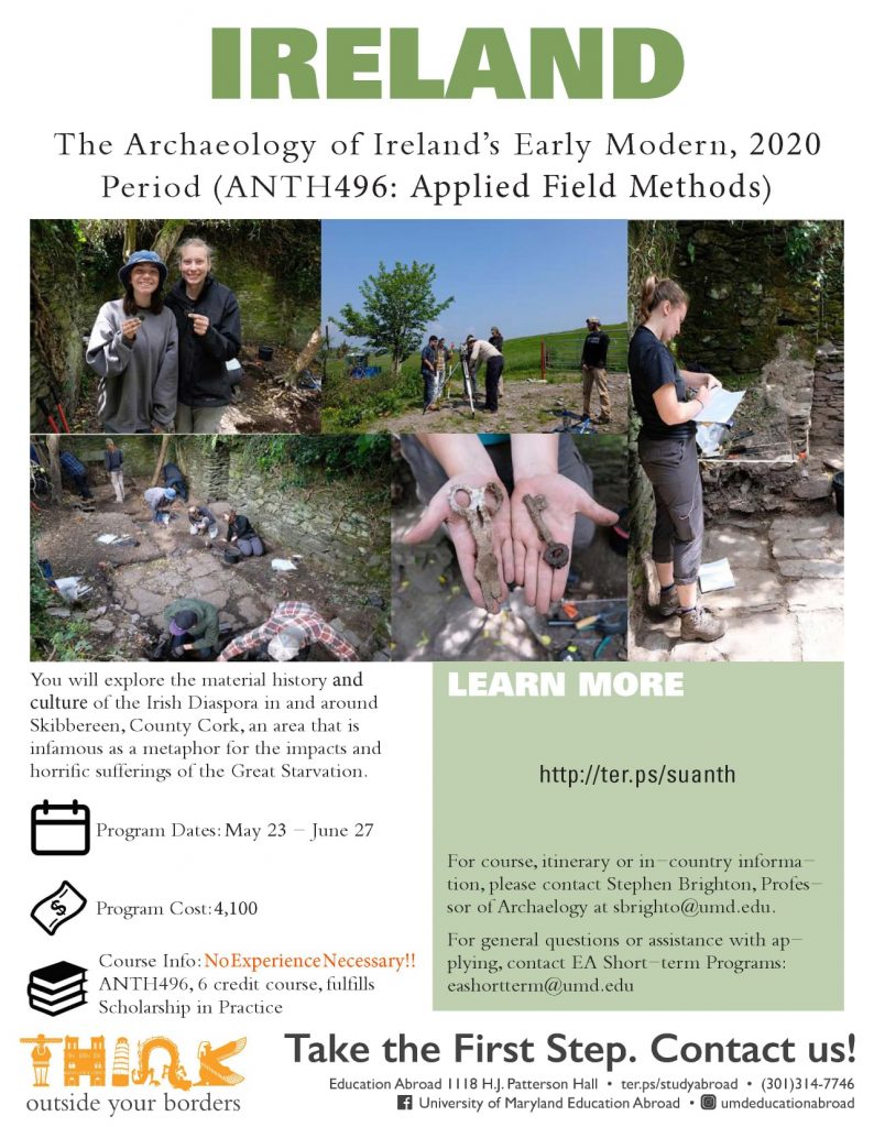 ​The Archaeology of Modern Ireland Field School explores the material history of the Irish Diaspora in and around Skibbereen, County Cork, an area that is infamous as a metaphor for the impacts and horrific sufferings of the Great Starvation. Through archaeological investigations, archival research, and interviews with local historians of the Skibbereen Heritage Center and members of the local community, students will receive extensive and intensive experience learning about the Irish Diaspora, socio-cultural change in Ireland over time, and the experience of Irish immigrants internationally.