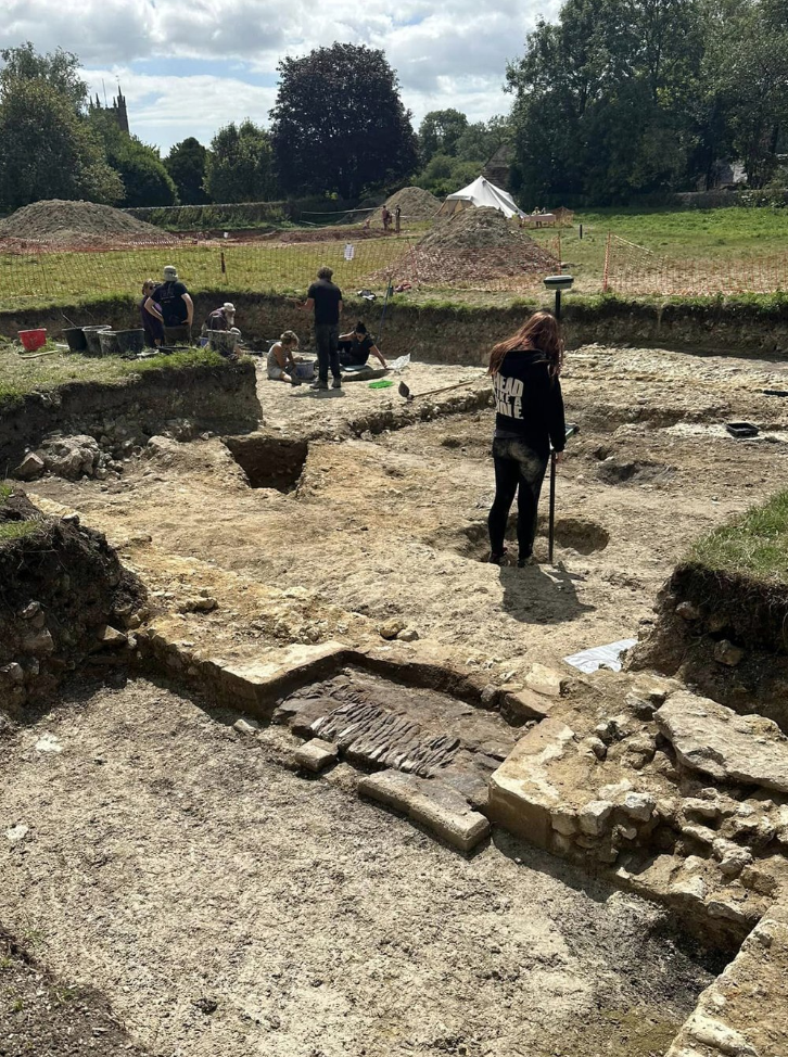 In 2024 we focused on locating the west end of the monastic church. Although this area was heavily disturbed by post-medieval robbing, we found sections of intact flooring and evidence for earlier phases of construction that were destroyed in a major 13th-century remodelling. A second trench was located over a building and open area to the north of the cloister. This appears to have originally been built as a high-status medieval hall, possibly an earlier abbot’s lodging, which by the 15th century was being reused as a glazier’s workshop. In 2025 we continued our investigation of the medieval hall identified last summer, as well as locating the conduit house that fed the cloister with fresh water.