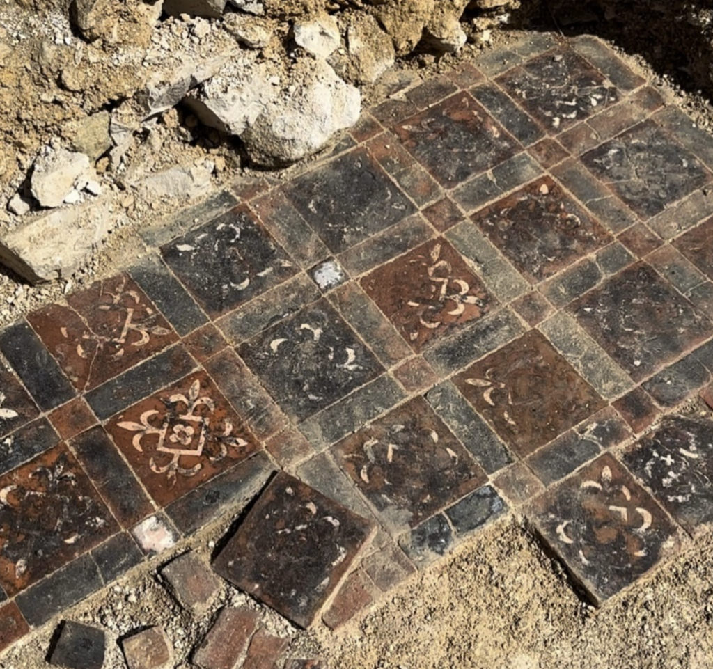 Excavations in 2023 started to investigate these results, with a trenches located over the southwest corner of the cloister, which includes part of the west range and the north aisle of the monastic church. Although heavily robbed, our work revealed evidence for decorative tiled floors and even an intact burial in the cloister walk way. It seems that the cloister was extensively rebuilt in the 13th century and elaborately decorated with Purbeck marble detailing. We found a number of fragments of highly decorative carved stone that still retained evidence of original paintwork in red, white and orange) as well as surface gilding. These almost certainly came from a very important structure within the abbey church, possibly a tomb or even a shrine.