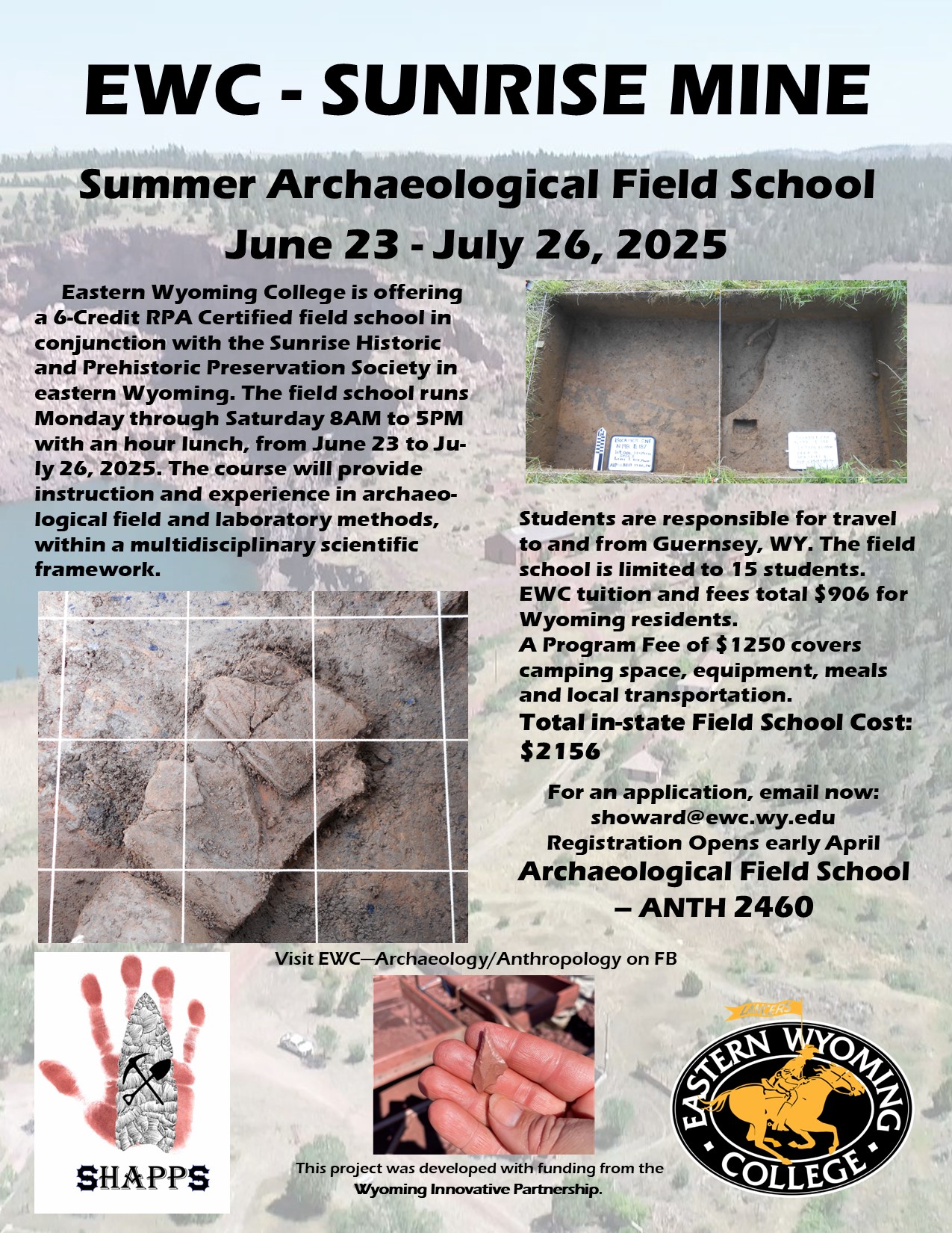 Eastern Wyoming College is offering a 6-Credit RPA Certified field school in conjunction with the Sunrise Historic and Prehistoric Preservation Society in eastern Wyoming. The field school runs Monday through Saturday 8AM to 5PM with an hour lunch, from June 23 to July 26, 2025. The course will provide instruction and experience in archaeological field and laboratory methods, within a multidisciplinary scientific framework. There will be specialized training in CRM and in various methodologies including Geophysics and modern dating techniques. The field school is located at an old mining town in the hills of the Hartville Uplift, and is the site of one of the earliest known red ochre mines in North America. Students will participate in research to understand the lifeways of the Paleoamericans who frequented the mine, and any symbolic importance and geopolitical dynamics that may have surrounded such a site.