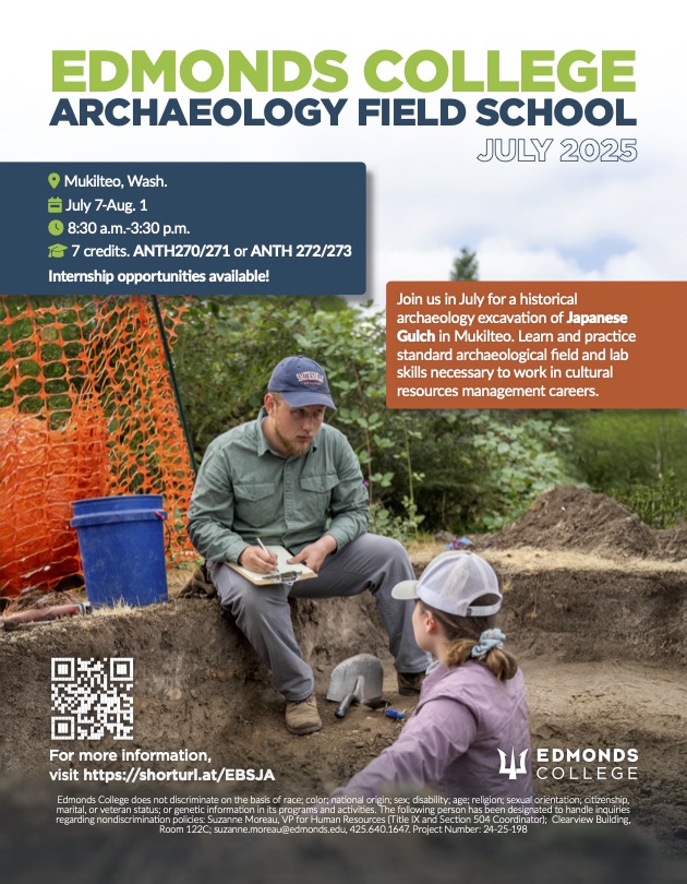 Edmonds College ran a successful archaeological field school in 2012 at Japanese Gulch in Mukilteo, Wash., and will be returning to this site in July 2025 for an exciting new season. Japanese Gulch developed alongside the Mukilteo Lumber Company, which began hiring Japanese workers in 1903. The community grew from 35 residents in 1903 to 100 by 1909, expanding further after the Crown Lumber Company purchased the mill. Japanese-American workers were vital to industries across the Pacific Northwest, including lumber, farming, and railroads (NWAA 2009, 14). Ethnographic accounts and archaeological evidence reveal a vibrant community with single-story family homes, a dormitory for 45 single men, a playground, a community hall, and a boys’ club (SWCA 2011, 13–14). Residents sourced goods from Japan or local merchants, utilized nearby resources, and shopped at the Crown Company Store (NWAA 2009, 55–56). However, the late 1920s economic downturn led to the Crown Lumber Company’s closure in 1930, causing residents to leave in search of work and marking the decline of Japanese Gulch. Join us in July to uncover more details about this community and their everyday lives. You will learn and practice standard archaeological field and lab skills necessary to work in cultural resources management careers.