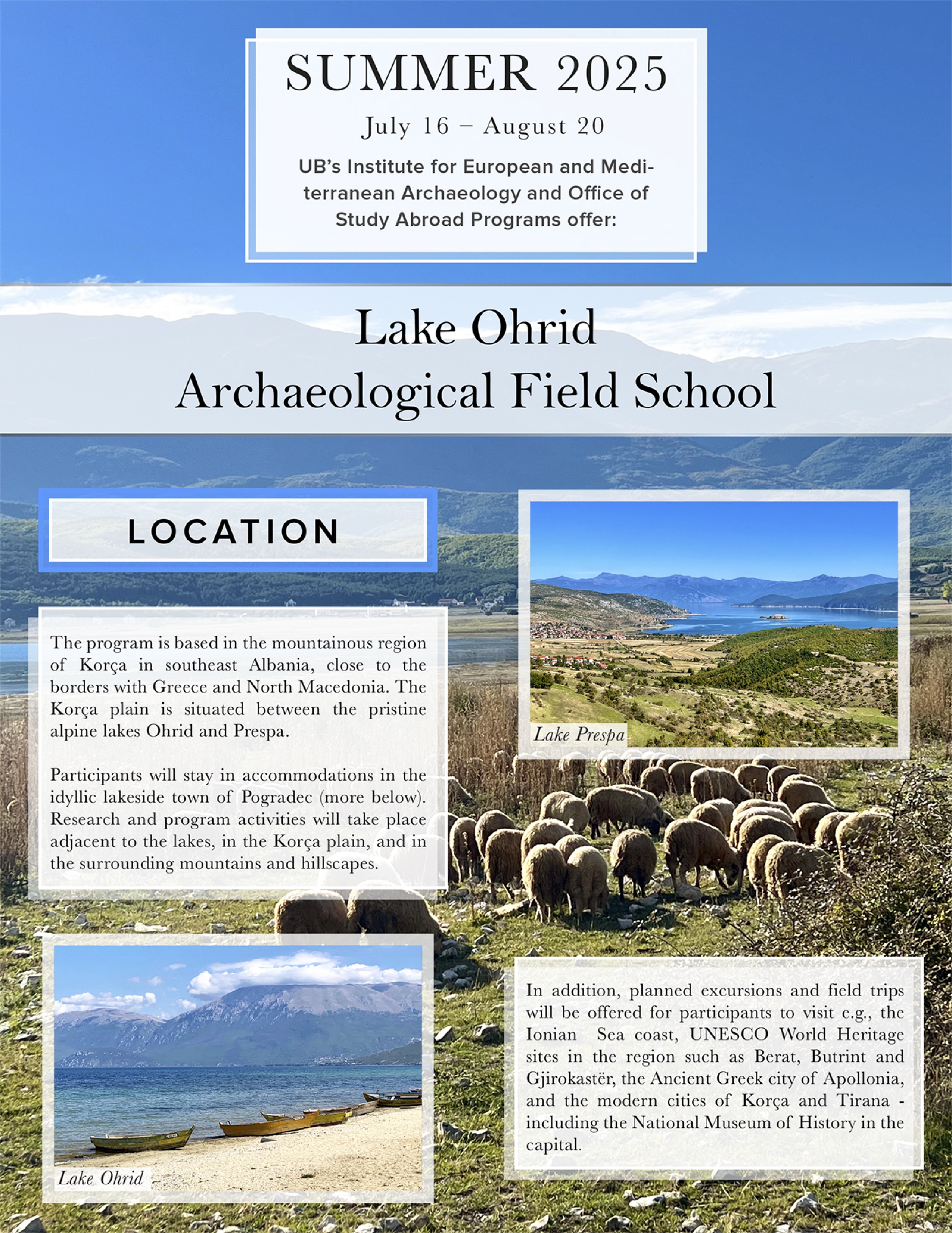 The Lake Ohrid Archaeological Field School and study abroad program in Albania – The program is being offered for the third time this summer (July 16–Aug 20) through University at Buffalo Study Abroad. The program will provide training in a variety of archaeological and paleoecological methods and a unique cultural experience through planned tours and excursions in the heart of the Balkans and on the Ionian Sea coast. We will stay on the UNESCO listed shoreline of Lake Ohrid in the idyllic town of Pogradec, and collaborate with other prominent universities such as Oxford, Bern, and Cologne throughout the course of the program, giving students the chance to experience a variety of research traditions and build their academic networks.