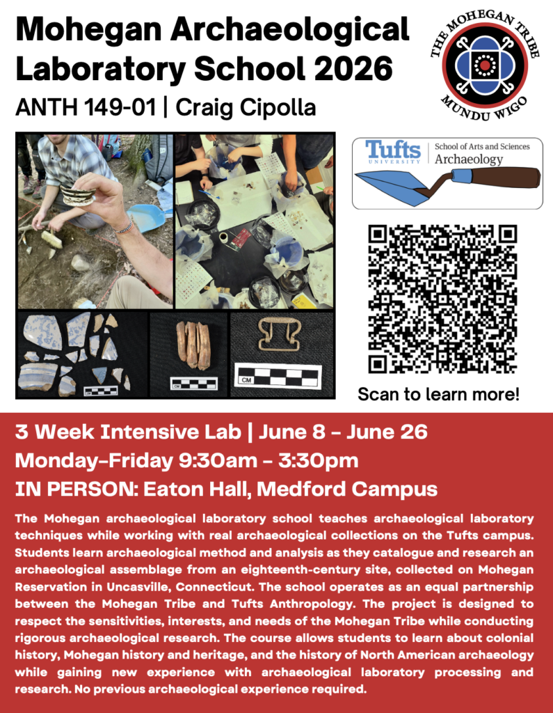 The Mohegan archaeological laboratory school teaches archaeological laboratory techniques while working with real archaeological collections on the Tufts campus. Students learn archaeological method and analysis as they catalogue and research an archaeological assemblage from an eighteenth-century site, collected on Mohegan Reservation in Uncasville, Connecticut. The school operates as an equal partnership between the Mohegan Tribe and Tufts Anthropology. The project is designed to respect the sensitivities, interests, and needs of the Mohegan Tribe while conducting rigorous archaeological research. The course allows students to learn about colonial history, Mohegan history and heritage, and the history of North American archaeology while gaining new experience with archaeological laboratory processing and research. No previous archaeological experience required.