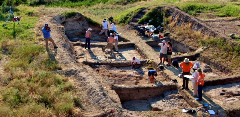 The archaeological field school takes place at the Tell Yunatsite lowest excavated layer, which corresponds to the time of Europe’s first prehistoric civilization in the 5th millennium BCE. The intense study of these very first complex societies in Europe began 40 years ago with the excavation of the Varna Copper Age necropolis. That excavation was the first to demonstrate the rise of social complexity in the region. It is during this time that metal processing became widespread and it is the earliest dates for such transformative technological innovation. Data suggest that it is the world’s earliest mass production of both copper and gold (the world’s oldest gold treasure was found in the Varna Copper age necropolis), the first urban settlements in Europe, distinct social and political stratification, and pictograms and characters interpreted by some scholars as the world’s oldest script (as on the Gradeshnitsa tablet, for instance). The area of this civilization stretches from Anatolia across the Balkans to the Carpathian basin and the steppes of Eastern Europe. It collapsed around the end of the 5th millennium BCE under the pressure of drastic social and demographic changes, which were presumably caused mainly by climate change but were exacerbated by foreign invasions.