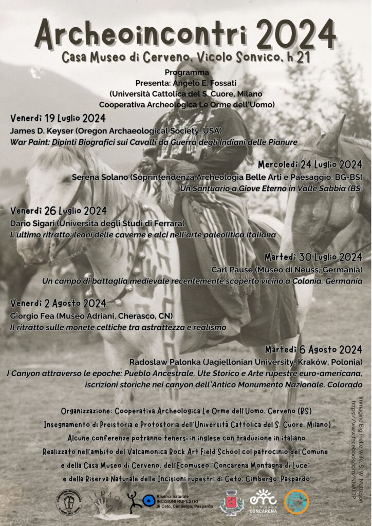 During each week-long fieldwork session, participants will also have evening lectures on rock art subjects delivered by scholars of international fame, watch films, and have the opportunity to visit other rock art sites (such as the National Park of Naquane, at Capo di Ponte, the park of Foppe di Nadro, at Ceto, and the Park of Bedolina-Seradina at Capo di Ponte, Luine Park in Boario Terme), the two National Museums (the Prehistoric and the Roman) and some medieval churches with beautiful frescoes and sculptures.