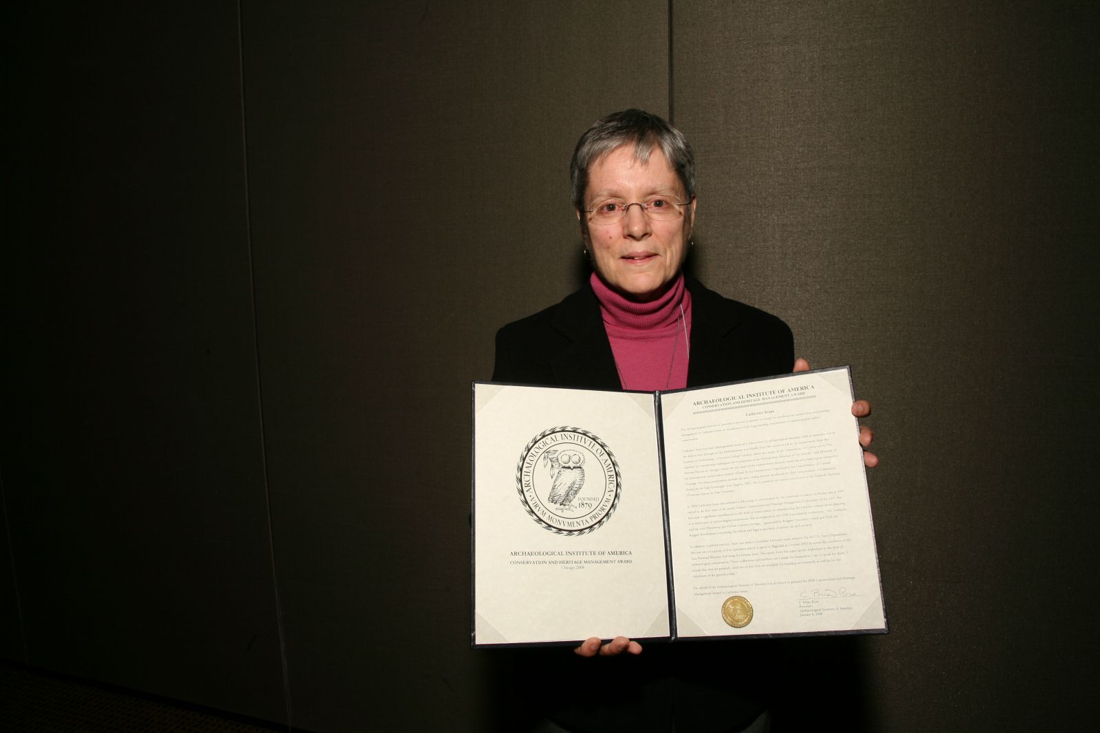 On behalf of the Archaeological Institute of America, it is an honor to present the 2008 Conservation and Heritage Management Award to Catherine Sease.