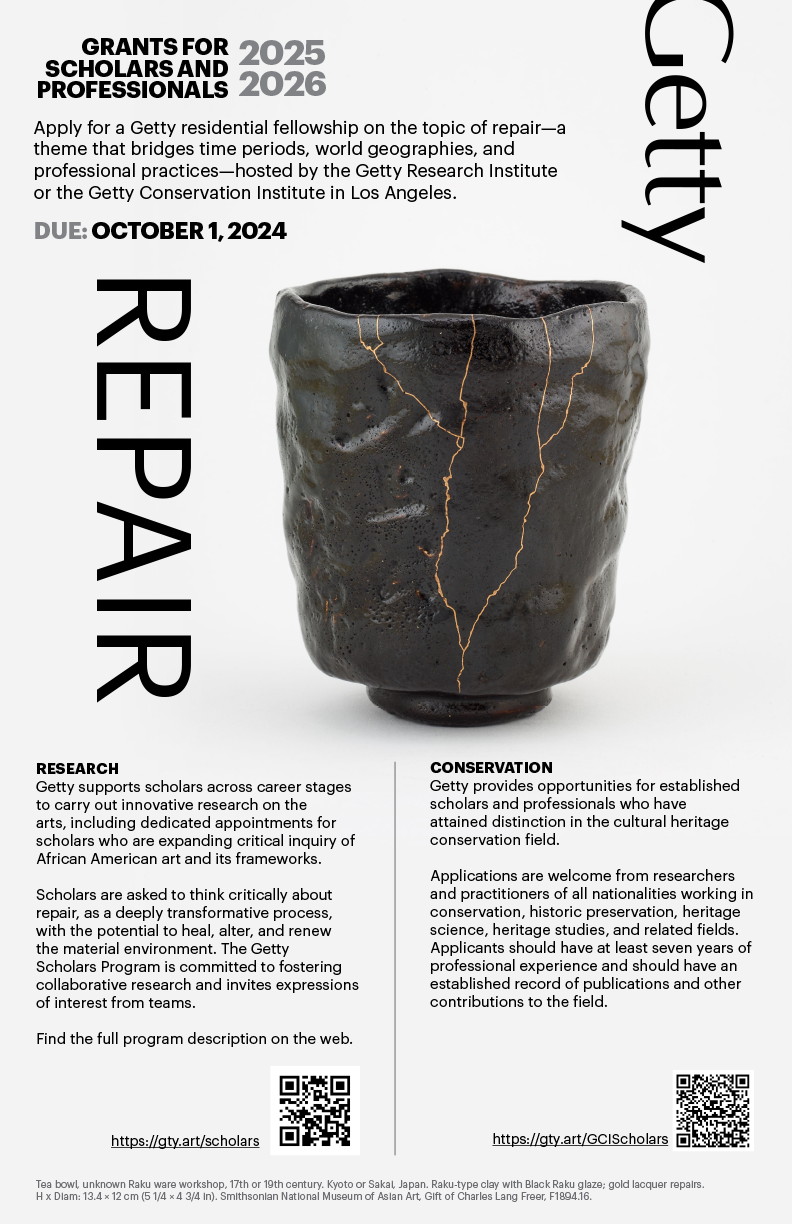 For 2025–2026, Getty invites scholars and arts professionals to apply for a residential fellowship on the topic of repair, a theme that bridges time periods, world geographies, and professional practices. Situated between the forces of creation and destruction, the act of repair can be deeply transformative, with the potential to heal, alter, and renew the material environment. Scholars are asked to think critically about repair, questioning interpretive assessments about the ideal state of any object or site, in addition to querying what constitutes damage or whether to repair the ruined or the broken. Beyond such physical interventions, art and sites of commemoration are often mobilized to heal a fractured social fabric. Indeed, art itself may be offered as reparation to address past wrongs or to recuperate loss. The issue of repair has deep bearing for the arts, conceived in the broadest sense, and especially for institutions that aim to preserve and share global cultural heritage.