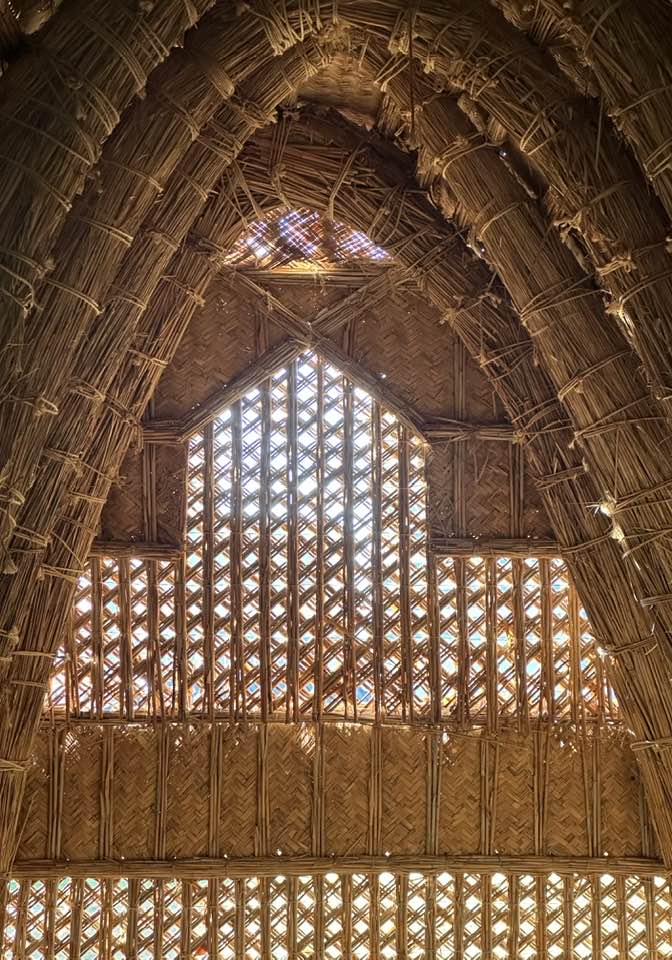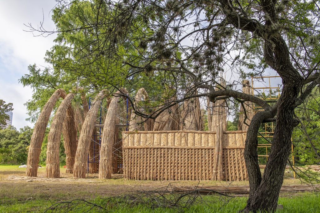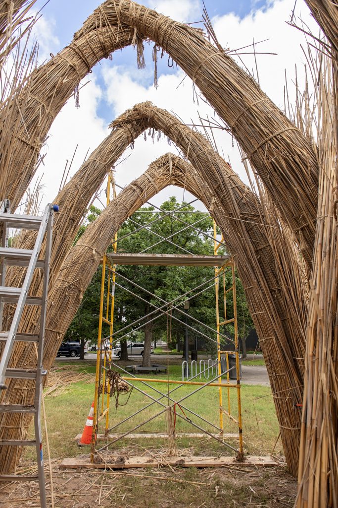 The Houston structure is only the second mudhif to be erected in the United States and the first that was done with reeds from the Iraqi marshes using traditional techniques. (A previous mudhif was built in Philadelphia, to reconcile the Iraqi community and Gulf War military veterans). A master builder, Meer Al Asadi, harvested the reeds from Iraqi marshes and constructed and wove all the components there, including columns for the arches, wall panels, roof mats, and reed bundles for struts and supports. Then, the separate pieces were loaded into a shipping container and hoisted onto a ship for transport to Houston. Unfortunately, the container took the “scenic route,” involving several ships, the Suez Canal, an onboard fire, and stops in Spain and South America, before finally arriving in the Port of Houston months behind schedule.