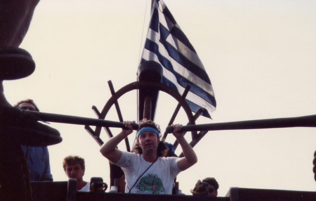I started going to the Richmond Society’s archaeology lectures. Our President at the time was my mentor, Gertrude Howland. I have been told she was the AIA’s first Society Trustee and that the position was in fact created for her to have a seat on the Governing Board, but I haven’t verified that this information is correct yet. In 1992 and 1993, I was a member of the oar crew of the Olympias, a trireme replica operated by The Trireme Trust and owned by the Hellenic Navy. On July 27, 1992, I spent my 40th birthday pulling an oar on the Olympias, and was in fact permitted to operate the steering oars for a brief time on our voyage to Corinth (photo below).