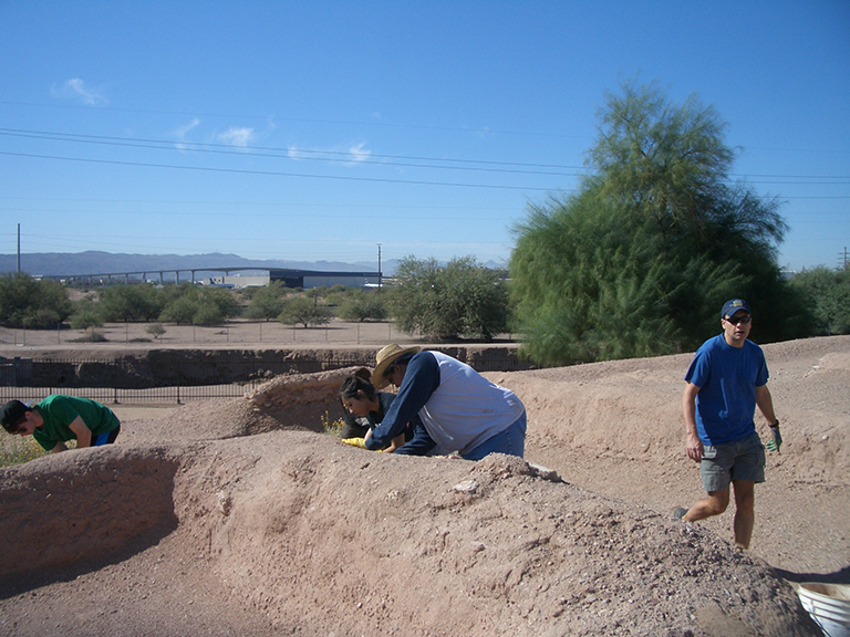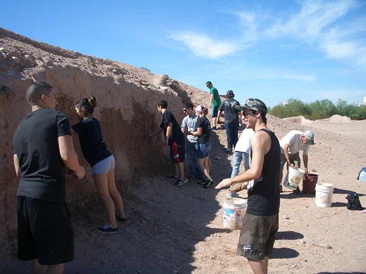 The Central Arizona Society of the AIA partnered with Pueblo Grande Museum in Phoenix, AZ for National Archaeology Day, and dozens of individuals became mudslingers for the day. Mudslinging is a stabilization technique for earthen structures, and it works well for Native American structures in the Southwest. Students from Paradise Valley Community College and Arizona State University (and their professors) joined the regular, volunteer mudslinging crew at Pueblo Grande to sling mud in order to preserve the platform mound.