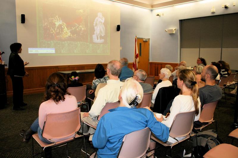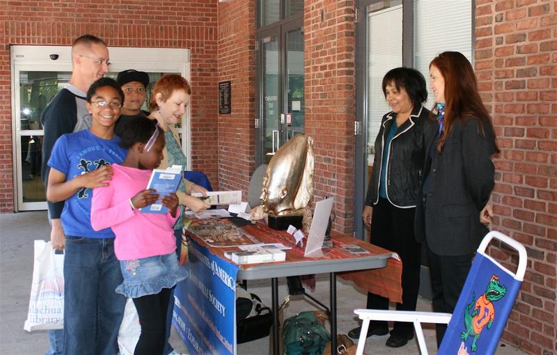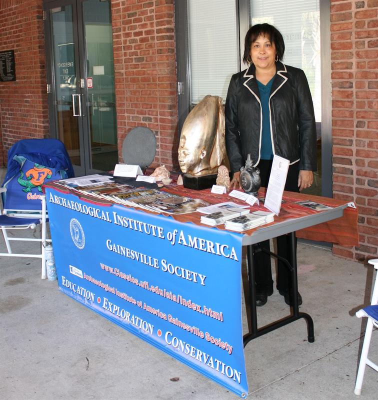 For National Archaeology Day members of the AIA-Gainesville Society staffed a display table outside of a popular local public library branch, the Millhopper Library. The table will be attended by members with AIA handouts, laptop showing slides of archaeology sites, flyers for upcoming lectures, Archaeology Magazine issues, and artifact reproductions from Egypt, North Coast Peru, and Mississippian culture. At 2:00 pm, University of Florida Classics Department Professor Mary Ann Eaverly gave a slide lecture, “The Last Days of Pompeii,” in the library lecture room. Thirty people attended the lecture including several children. Cookies, juice, and iced tea were served before and after the lecture.