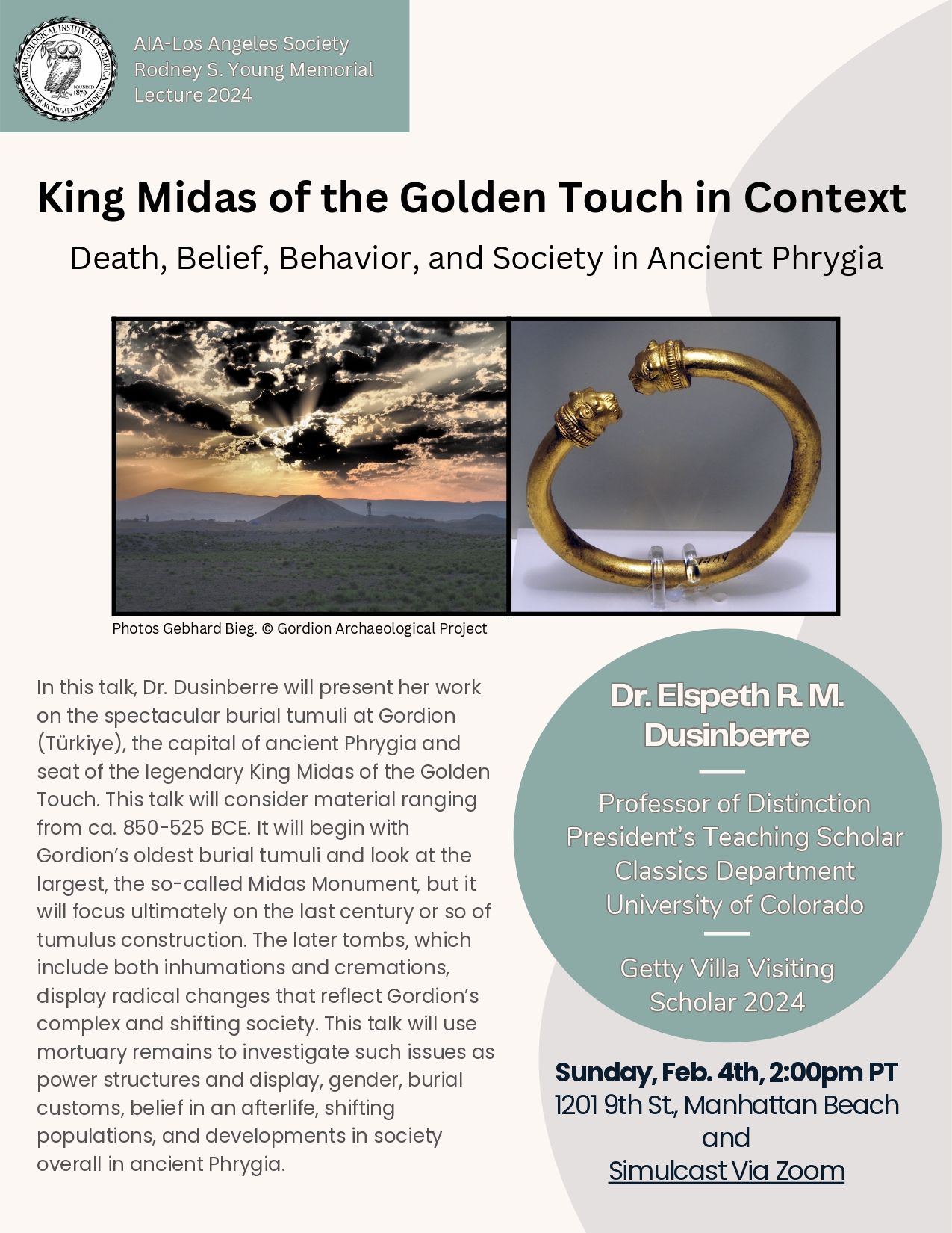 Elspeth Dusinberre (University of Colorado Boulder) will present her work on the spectacular burial tumuli at Gordion (Türkiye), the capital of ancient Phrygia and seat of the legendary King Midas of the Golden Touch. This talk will consider material ranging from ca. 850-525 BCE. It will begin with Gordion’s oldest burial tumuli and look at […]