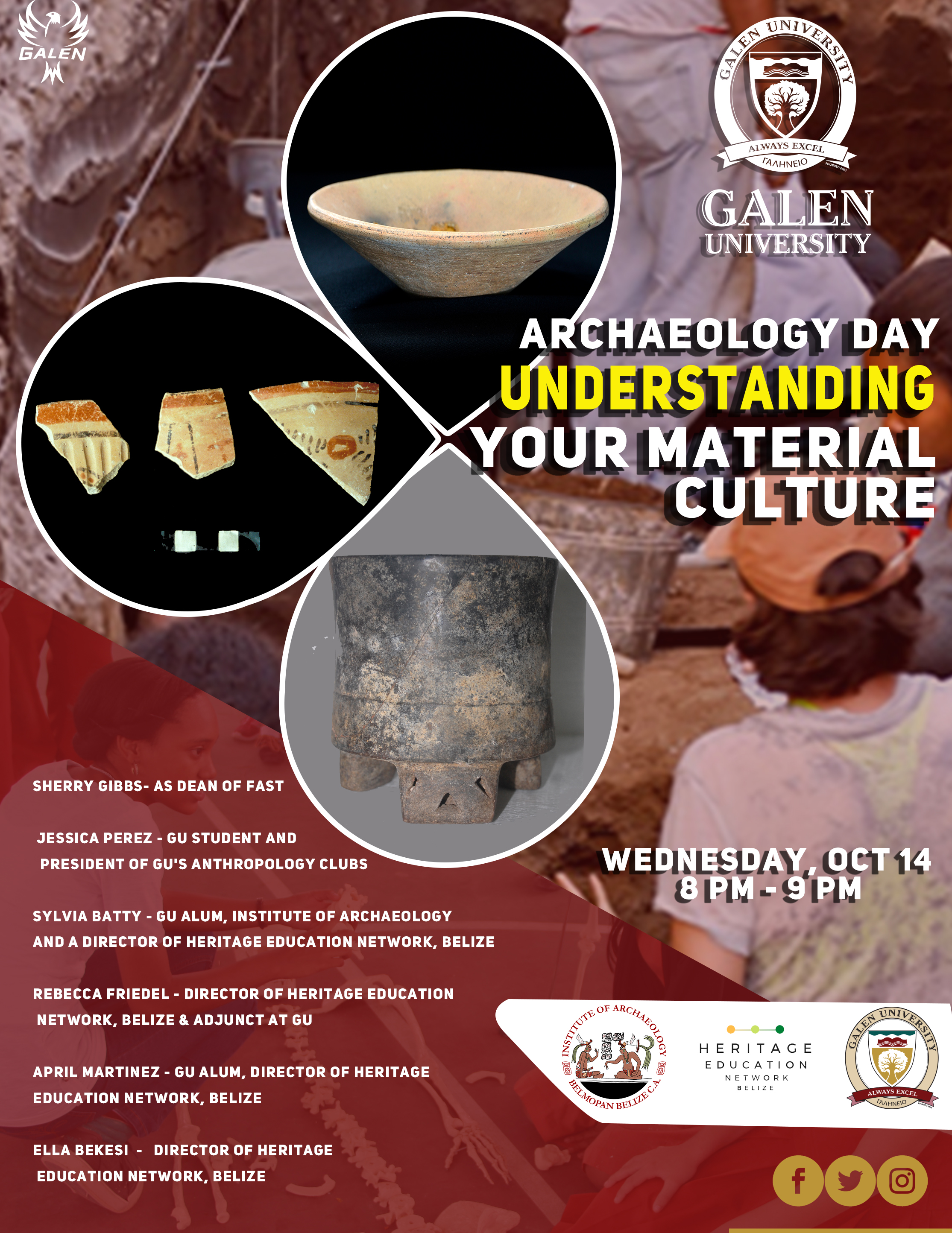 Galen University's Anthropology Club will celebrate International Archaeology Day at the Welcome Center in San Ignacio, Cayo, Belize. Students and community members are all invited to participate in the various activities where they will learn all about archaeology, including: Archaeological sites of Belize Artifacts from Belize Human Skeleton Maya Hieroglyphs What archaeologists 'do'