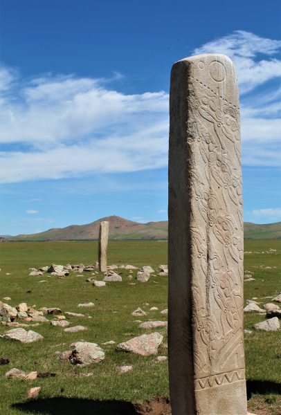 This is a photo of the deer stone complex in Khanuy Valley. Deer stones are monuments found throughout the Mongolian steppe and depict scenes of animals, weaponry, and often include a sun motif or a face on the top of the stone. These were carved and erected throughout the Bronze Age in Mongolia
