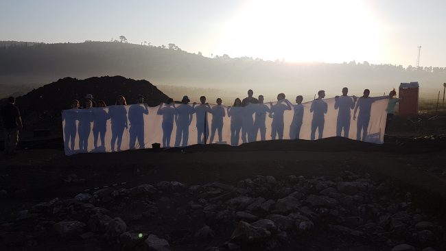 young boys trying to block the sun light while taking photos of the site at the sun rise .