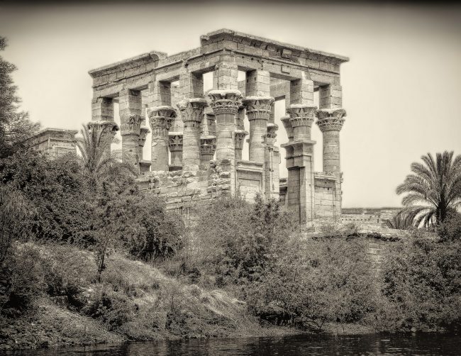 An old-style photo impression of the Kiosk of Philae seen from a felucca on the Nile at Aswan, Egypt. The Philae temple ruins were dismantled and reconstructed on higher ground in the 1960s to avoid damage from flooding.