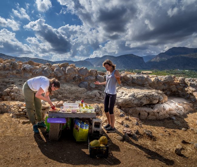 6:30 start with a half hour break for food at 10:00. Breakfast for more than 100 excavators at the Minoan settlement, Sissi, Crete.