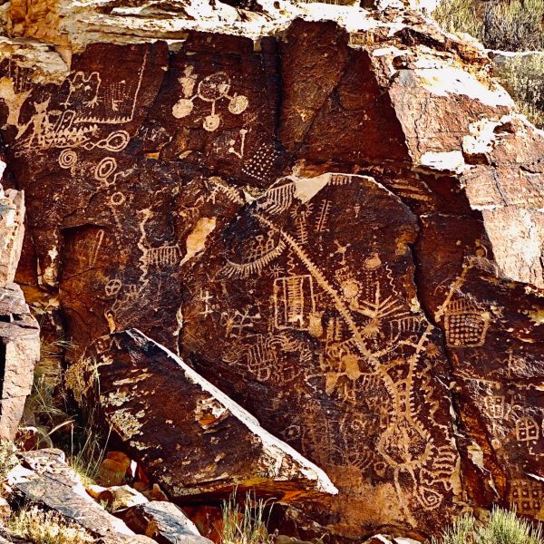 This site is a nationally recognized extravaganza of petroglyphs--a superb "gallery" of Native American rock art. Here one can witness what is at least a 1,000 year accumulation of artwork pecked into the rock. Geometric designs, images of lizards, snakes, mountain sheep, bear claws and human figures adorn the smooth canyon walls of the pass.