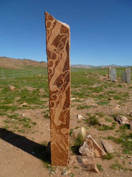 Deer stone, The stone is 205 cm height, on the face side painted by red-brown ochre, and on there carved orange 3 deer. This deerstone has very best figure and nice colors...