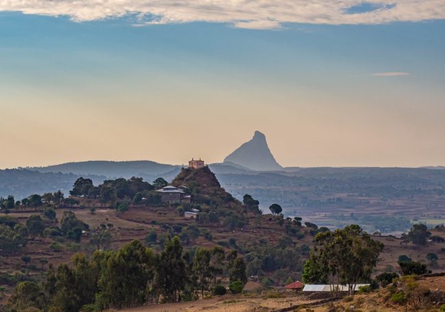 The 6th Century AD monastery of Abba Pantaleon sits perched above Axum. Spires and flat-topped mountains are found throughout the red landscape of Tigrai as places of power, often hiding a monastery or two. Many times these monasteries became local museums where people would store their important heritage and the curious artifacts they found while plowing the fields. In the back stands the fearsome Daamo Galila. People remember it now for the old totalitarian Derg camp once located there, and from how the regime previously set out to erase such material histories from the Ethiopian landscape.