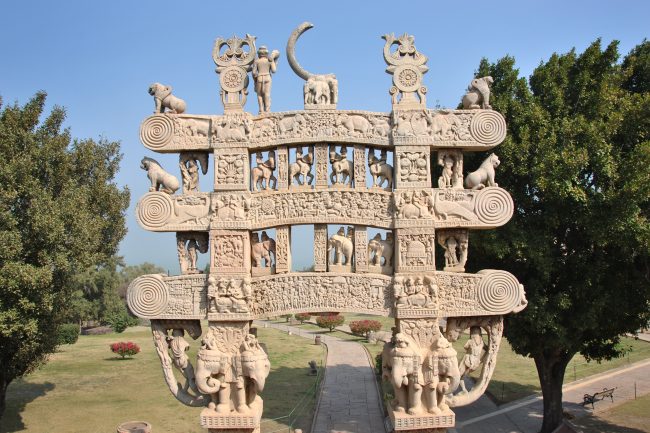 The Sanchi Great Stupa’s North Torana (view from the south). The monument was commissioned by the Maurya Dynasty king Ashoka the Great (reigned c. 268-232 BC) and was extensively upgraded by the rulers of the succeeding Shunga and Satavahana Dynasties.