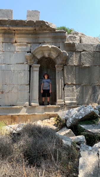 Pretending to be a statue at an ancient find at Termessos, way up in the mountains. Even Alexander the Great had to turn back, but not my son.