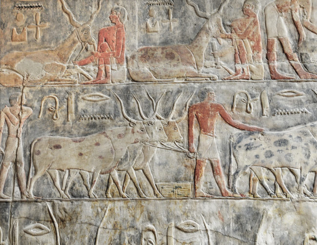 A painted wall relief in a Saqqara tomb showing an Egyptian man leading his cattle