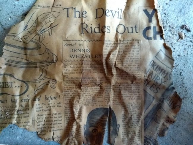 The Devil Rides Out by Dennis Wheatley, serialised in The Daily Mail, 18 December 1934. Fragment of newspaper found preserved in a clinker drain in the basement of the Turnbull Building, Newcastle-upon-Tyne.