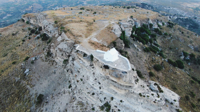 The site of the Iron Age settlement on the Patela of Priniàs and the church of Agios Panteleimon.