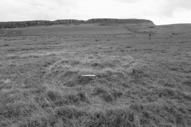 A barely perceptible medieval or post-medieval stack stand in the foreground, marked with a 1m ranging rod and trowel pointing North, while the imposing Sewingshields Crag dominates the background with Hadrian's Wall running along its crest.