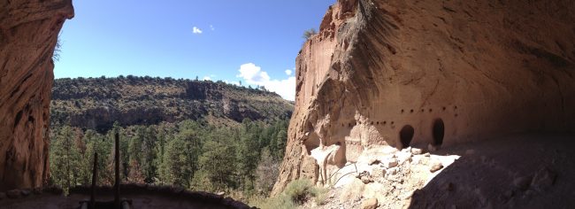 Image of the Alcove House, taken 140ft above the floor of Frijoles Canyon. The pueblo was the home of around 25 Ancestral Pueblo people, and part of a larger settlement dating from the Pueblo III Era (1150 to 1350) to the Pueblo IV Era (1350 to 1600). I reached the site with my Mother, by climbing four wooden ladders and stone stairs. At the end of the trail we were rewarded with a view of the canyon below, and the niches of the former habitations carved directly into the cliffside.