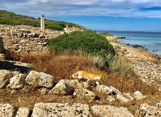 "Spartacat" stalks a lizard among the Roman ruins at Tharros.