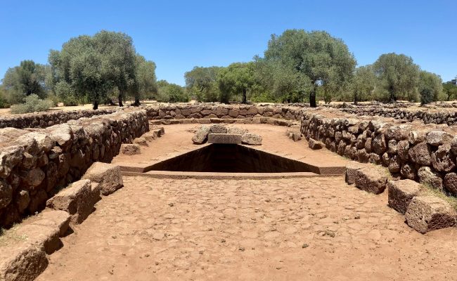 Triangular entrance to the mysterious Nuragic well at Santa Cristina. Stairs descend to the water, where sunlight shines through a small aperture on the well shaft cover on every equinox.