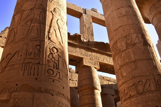 The towering columns and architraves of the Great Hypostyle Hall are covered in detailed inscriptions and hieroglyphic texts from the ground to nearly 100 ft. in the air. The play of light across these detailed scenes emphasizes and highlights both the power and importance of the pharaoh and the skills of the artisans.