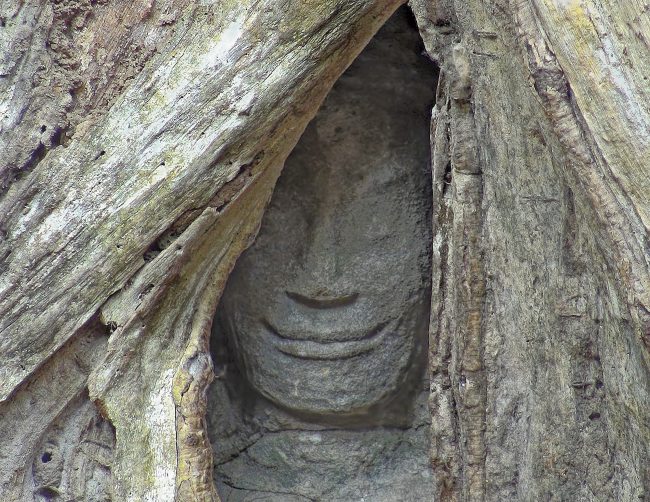 A stone carving engulfed by a tree root at Ta Prohm Temple