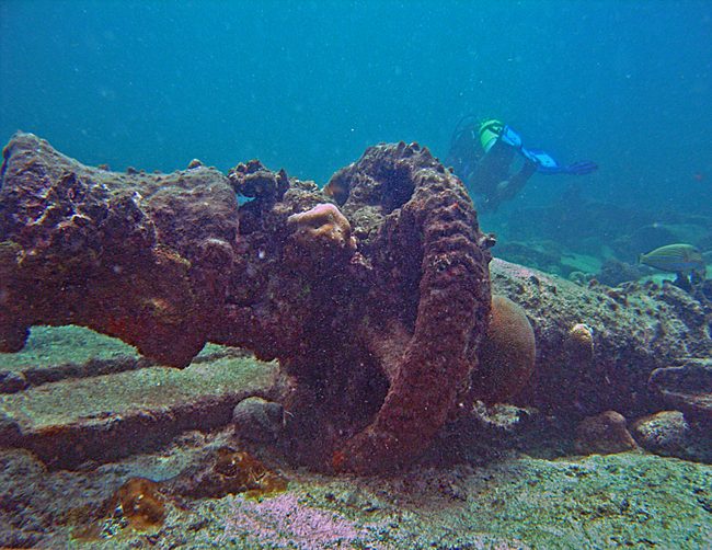 This iron structure, covered with coral and algae growth, is part of a shipwreck in the Indian Ocean. The ship, named the “Lion,” was wrecked in 1901 on the south side of Grande Terre Island. The wreck is found at a depth of 30-50 feet which makes for an easy dive in the relatively clear, warm water – a good subject for a marine archaeologist.