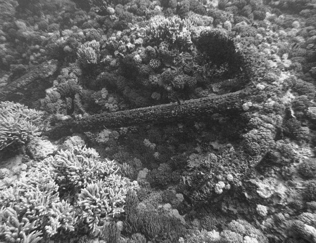 This anchor, at an ocean depth of about 50 feet, was one of several seen near the site of the wreck “Acadia,” a mail ship that ran aground off Ducie Island on June 5, 1881. A marine archaeologist is needed to establish its origin.