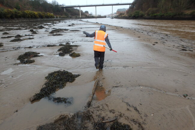 Field tech walks along the mast of a wrecked boat in the tidal zone of the River Esk. Whitby, North Yorkshire, UK.