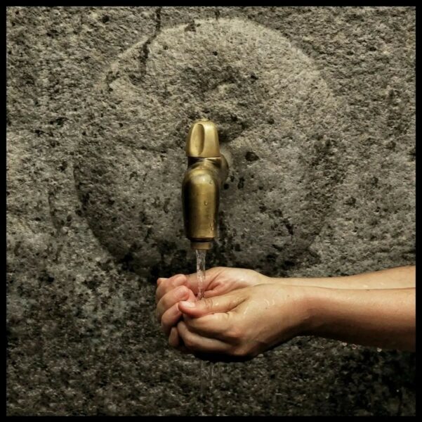 A quick snapshot of a woman using a converted Ancient Roman water fountain in the ancient city of Pompeii