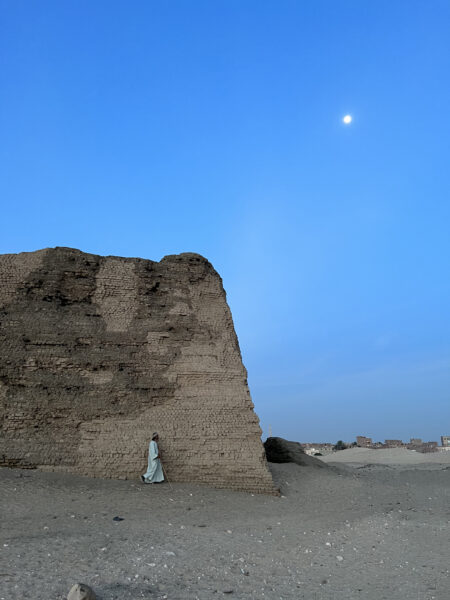Moonrise over the "Shunet el-Zebib,” Egypt's oldest standing temple architecture at Abydos. Egyptian site guard, Hussein Raslan, walks under a rising moon beside the nearly 5,000-year-old funerary temple of King Khasekhemwy, dating to Egypt’s Second Dynasty ca. 2700 BCE, during excavation at the archaeological site of Abydos in 2024. The only surviving progenitor of the royal pyramid complex, the Khasekhemwy Enclosure, known today as the Shunet el-Zebib (Arabic for “House of Raisins”), has been the focus of over twenty years of archaeological investigation and architectural conservation. During that time, more than half-a-million new mud bricks (shown in lighter contrast areas of the photo) have been fabricated using traditional methods and integrated into the original fabric of the monument to ensure its survival long into the future. Photo by Wendy Doyon for Abydos Archaeology, https://abydos.org.