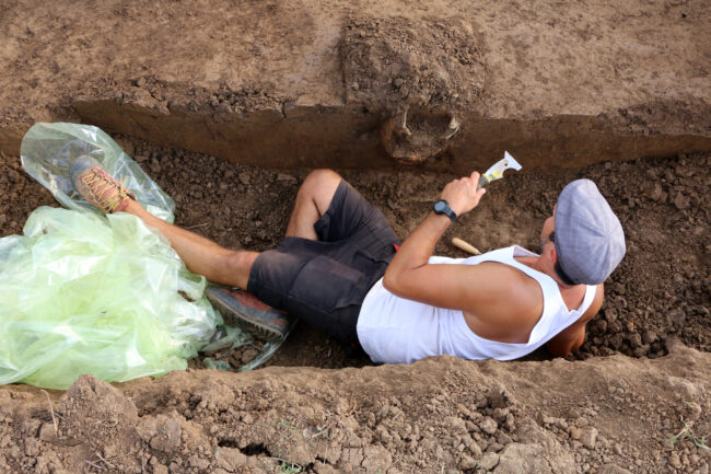 During research of a Celtic shrine in the Eastern necropolis of Sboryanovo a clay pot was found. The area around was carefully examined, while the scientists took uncomfortable position to do so.