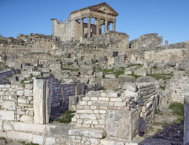The Capitol, a Roman temple from the 2nd century, in the ancient city of Dougga, Tunisia.