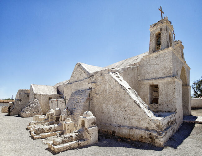The Church (Iglesia) of San Francisco de Chiu Chiu, the oldest church in Chile, built in 1650. The graves of local priests are found in the courtyard.