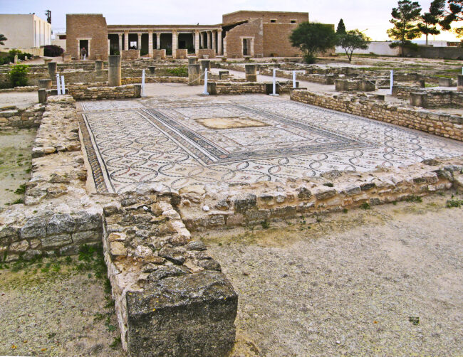 An expansive Roman mosaic in situ, excavated in the ancient Roman city of Thysdrus.