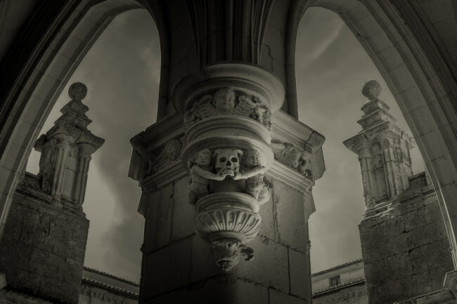 The photo shows the high reliefs of a capital in the cloister of the medieval monastery of San Zoilo, in Carrión de los Condes, Spain. The initial aim was to remind the monks that life is ephemeral and sin should be avoided, but today it is amusing to see the contrast of the cherubs and the skull.
