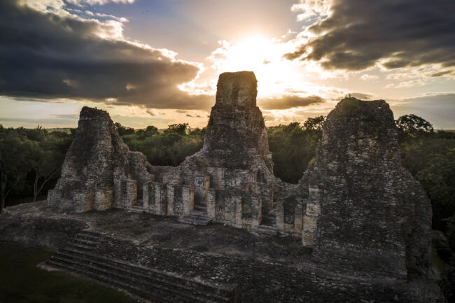 Only birds, bats and lizards live now in the Rio Bec courts, but the Wheels of Time stubbornly continue to roll... Rio Bec is the most elaborate and amazing architectural style throughout the lifespan of Maya civilization. The Sun sets over the Palace of the Three Towers as it did over a thousand years ago