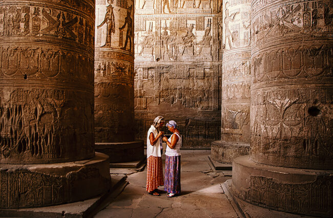 The image shows the interior of **Dendera Temple**, with two women standing in the middle of large, intricately carved stone columns. The ancient Egyptian hieroglyphs and reliefs on the columns and walls depict deities and mythological scenes, creating a grand, historical atmosphere. The women appear to be in quiet conversation or reflection, adding a sense of intimacy against the monumental scale of the temple's architecture. Sunlight softly illuminates the scene, highlighting the detailed carvings and enhancing the serene, timeless feeling of the ancient setting.