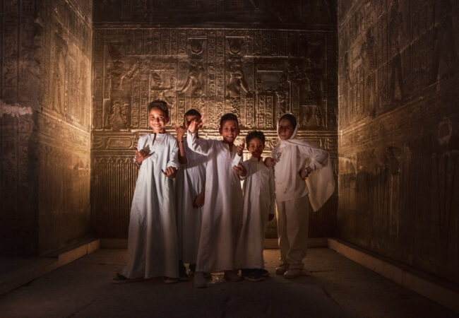 The image shows the interior of **Dendera Temple**, with two women standing in the middle of large, intricately carved stone columns. The ancient Egyptian hieroglyphs and reliefs on the columns and walls depict deities and mythological scenes, creating a grand, historical atmosphere. The women appear to be in quiet conversation or reflection, adding a sense of intimacy against the monumental scale of the temple's architecture. Sunlight softly illuminates the scene, highlighting the detailed carvings and enhancing the serene, timeless feeling of the ancient setting.