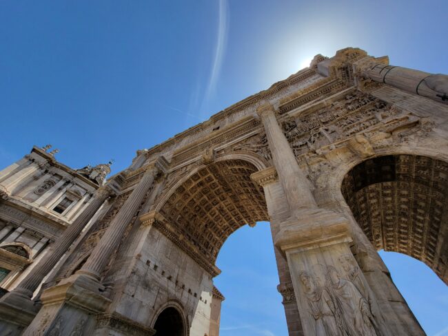 A photo of the Arch of Septimius Severus taken from below in the Roman Forum. To the left is the Chiesa Santi Luca e Martina Martiri. This photo is taken during the hike up Capitoline Hill (Campidoglio)